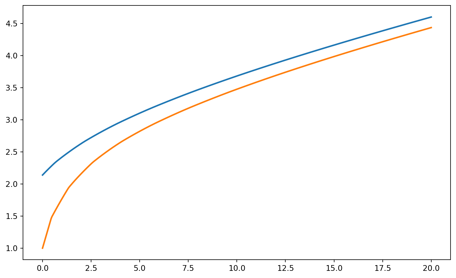 plt.plot(a_grid, c_low, label='Low Income', linewidth=2)