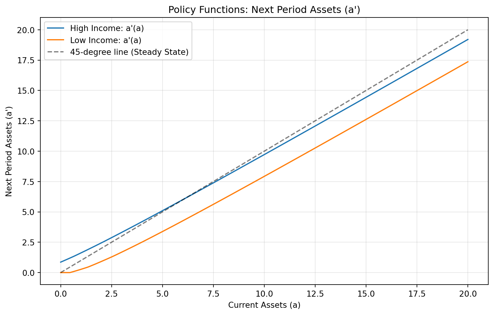 In this blog, we have implemented a true EGM approach. An exogenous grid on \(a'\) (next-period assets), using the Euler equation inverted analytically to get \(c\) directly, and recovered current assets \(a\) recovered endogenously via \(a = a'/R + y - c\). We also handled binding constraints, our function detects when \(a < a_{\min}\) (borrowing constraint binds), and adjusts consumption to satisfy \(a' = a_{\min}\) exactly.