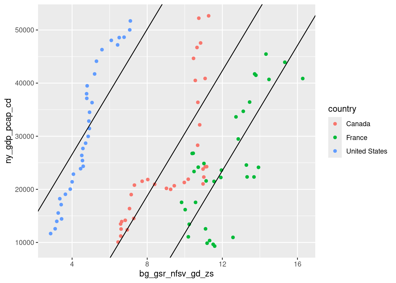 The \(\alpha_i\), even though they aren’t considered in calculating the slope of the line, are still being estimated. We can go back to the \(\alpha\)’s by looking at the first-order conditions of fixed effects estimation, from which we can calculate that \(\bar{\alpha_i} = \bar{Y_i} - \bar{X_i}\beta\). For each country in the dataset, then, we have a unique \(\alpha_i\), a country-fixed effect. Together with the slope we have just calculated they should now accurately describe the data. Let’s check to see whether that is true: