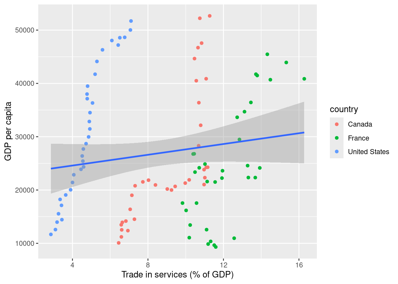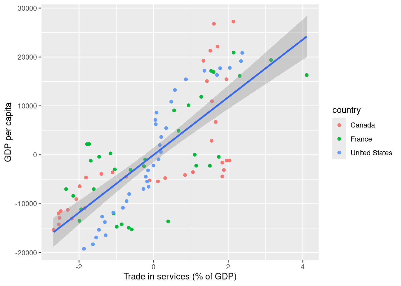 In this post, I will visualize what the FE-estimator does by benchmarking it to the OLS estimator. I use World Bank data on trade and GDP per capita to estimate (i) a regression equation with OLS, (ii) describing the procedure involved in estimating the FE coefficient and (iii) visualize what that means in this specific setting.