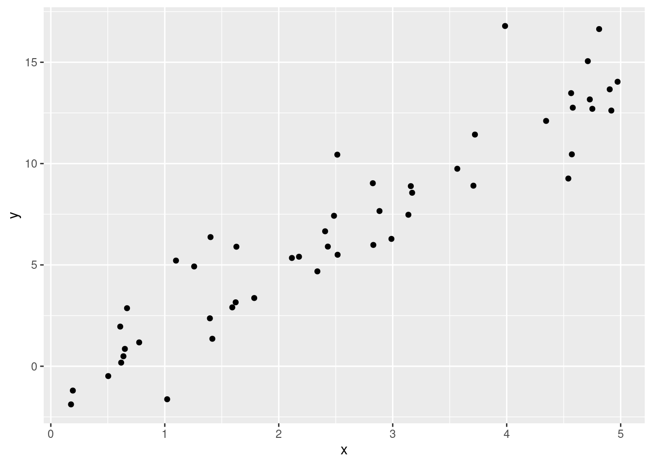 # Load regression librarieslibrary(tidyverse, quietly=TRUE); library(fixest, quietly =TRUE); library(modelsummary)# Reproducible randomnessset.seed(1234)# Set the parametersepsilon <-rnorm(n=50, mean=0, sd=2)beta <-3x <-runif(n=50, min=0, max=5)# Generate Y as a function of X and Epsilony <- x*beta + epsilon# Create a data.frame and plot the data pointsdf <-tibble(x=x, y=y)# Plotggplot(df, aes(x=x, y=y)) +geom_point()