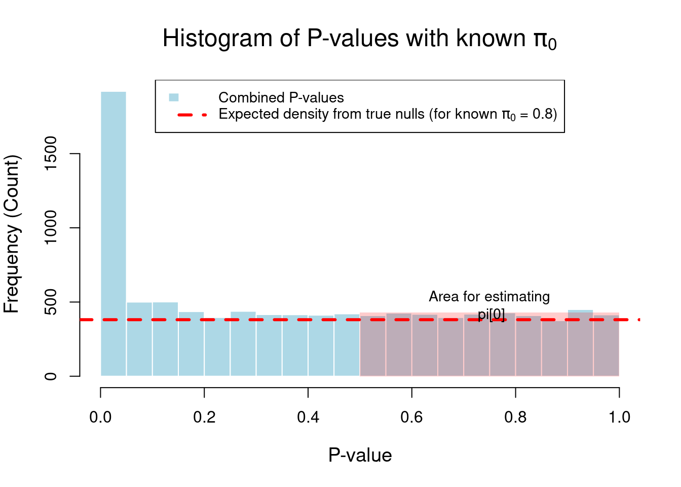 # 1. Simulation Setupset.seed(42) # for reproducibilitym <-10000# Total number of hypothesis testspi0_true <-0.80# We will assume 80% of the null hypotheses are true# Calculate the number of true nulls and true alternativesm0 <- m * pi0_true # Number of true nullsm1 <- m * (1- pi0_true) # Number of true alternatives# 2. Generate P-values# P-values for true nulls follow a uniform distributionp_values_null <-runif(n = m0, min =0, max =1)# P-values for true alternatives are skewed towards 0.# A Beta distribution with shape1 < 1 is a good way to simulate this.p_values_alt <-rbeta(n = m1, shape1 =0.1, shape2 =1)# Combine into a single vector of p-valuesp_values <-sample(c(p_values_null, p_values_alt))# 3. Visualize the Distribution# Plot a histogram of all p-valueshist_info <-hist(p_values, breaks =30, col ="lightblue", border ="white",xlab ="P-value", ylab ="Frequency (Count)",main =expression(paste("Histogram of P-values with known ", pi[0])),cex.main =1.5, cex.lab =1.2)# Add a line representing the expected density of true nulls# The height is the total number of true nulls divided by the number of binsexpected_null_height <- m * pi0_true /length(hist_info$breaks)abline(h = expected_null_height, col ="red", lwd =3, lty =2)# 4. Illustrate the Estimation Logiclambda <-0.5# Choose a tuning parameter lambda# Highlight the area used for estimation (p > lambda)# The y-coordinate is set just above the red line for visibilityrect(xleft = lambda, ybottom =0, xright =1, ytop = expected_null_height +50,col =rgb(1, 0, 0, 0.2), border =NA)text(x = (1+ lambda)/2, y = expected_null_height +100,labels =paste("Area for estimating\n", expression(pi[0])), cex =0.9)legend("top", legend =c("Combined P-values",expression(paste("Expected density from true nulls (for known ", pi[0], " = 0.8)")) ),fill =c("lightblue", NA),border =c("white", NA),lty =c(NA, 2),lwd =c(NA, 3),col =c(NA, "red"),bg ="white",cex =0.9)